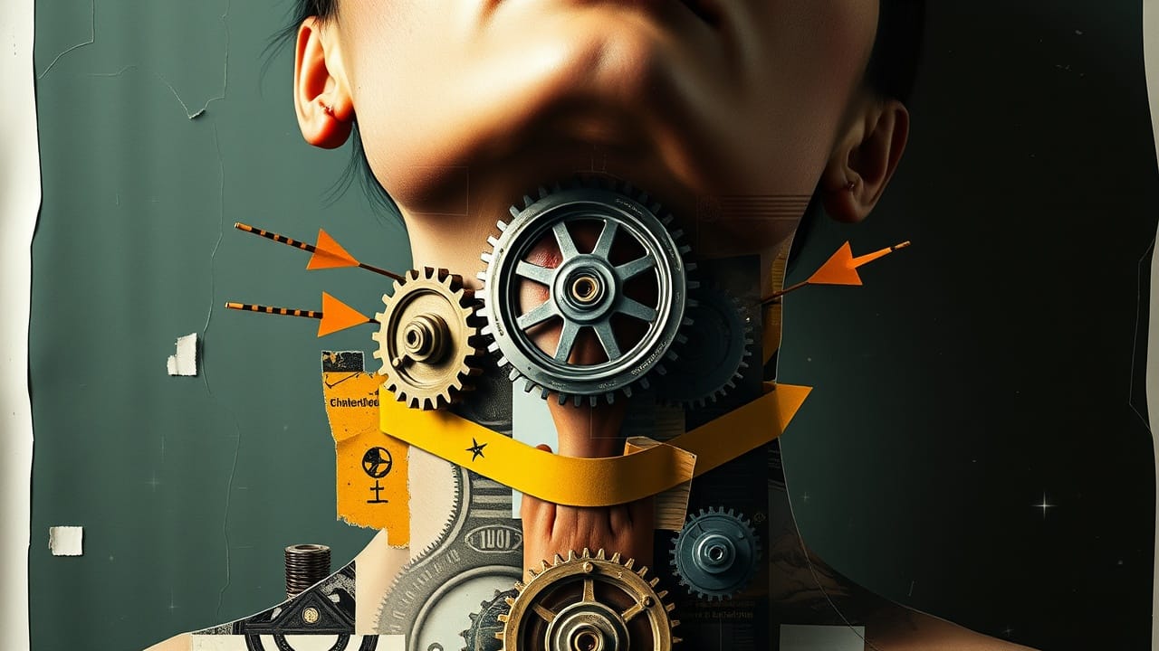 À partir de la photo portrait fournie d'une personne, remplacez uniquement son cou par un mécanisme complexe d'engrenages en laiton antique, tout en conservant le visage intact. Assurez-vous que les nouvelles parties projetent des ombres réalistes en fonction de la source de lumière d'origine.